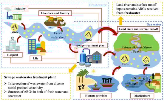 The nearshore sea acts as an integral connection between freshwater and marine ecosystems [44], intensifying the propagation and evolution of acquired ARB and ARGs via anthropogenic influences. These encompass medical treatments, industrial production, domestic wastewater discharge, and recreational activities, all contributing to elevated ARGs in seawater.