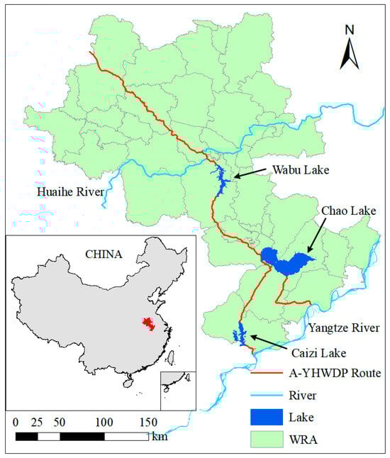 The Yangtze to Huaihe River Water Diversion Project (Figure 1), which connects the Yangtze River and the Huaihe River, is a major cross-basin and cross-regional water resource allocation and comprehensive utilization project [19]. The water-receiving area spans two provinces, Anhui and Henan, specifically including 15 cities: Anqing, Tongling, Wuhu, Ma’anshan, Hefei, Lu’an, Chuzhou, Huainan, Bengbu, Huaibei, Suzhou, Fuyang, and Bozhou in Anhui Province, as well as Zhoukou and Shangqiu in Henan Province. The total area of the water-receiving region is 70,600 km2. The project consists of three parts: the Yangtze River–Chaohu Lake Water Diversion, the Yangtze River–Huaihe River Connection, and the Yangtze River Water Northward Conveyance [20]. It fulfills a diverse range of water requirements, including those for agriculture, industry, household use, navigation, and ecological conservation, across the entire diversion route [21].