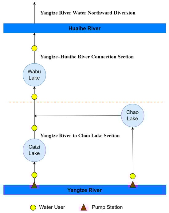 In Figure 2, the topological relationships of the A-YHWDP are summarized as a schematic diagram based on geographical locations. To model the core elements of the system and the interlinkages among key rivers, lakes and pumping stations are treated as nodal points, major rivers as connecting lines, and water users are appropriately distributed between the nodes along the water diversion route.