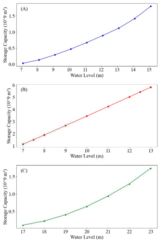 The water level–storage capacity curves of the lakes: (A) Caizi Lake, (B) Chao Lake, and (C) Wabu Lake.
