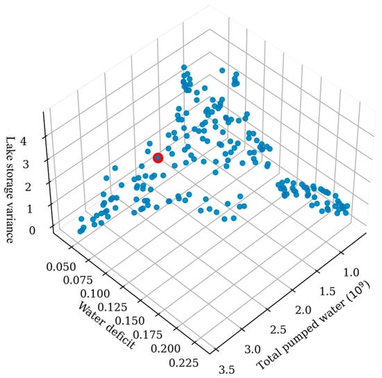 After conducting multi-criteria decision-making using the TOPSIS-Entropy weight method, the specific steps are as follows: First, the entropy weight method is used to assign weights to each objective, then TOPSIS is applied for comprehensive scoring, and the solution with the highest score is selected as the optimal one. The red marked point was identified as the optimal decision. The result of the optimized solution is a total pumped water volume of 1.84 × 109 m3, a total water deficit of 4.46%, and a storage capacity variance of 1.06 × 1015, as detailed in Table 2.