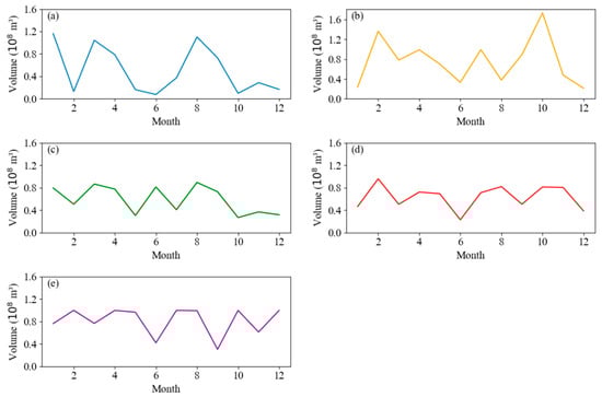 Additionally, Figure 6 displays the sequence values of five decision variables over a one-year period—the pumping volumes at two pumping station and the outflow volumes from three lakes. Figure 6a represents the Zongyang Pumping Station, Figure 6b represents the Fenghuangjing Pumping Station, Figure 6c represents Caizi Lake, Figure 6d represents Chao Lake, and Figure 6e represents Wabu Lake. The outflow from Caizi Lake and Chao Lake is influenced by the two pumping stations, respectively, while the outflow from Wabu Lake is jointly affected by both Caizi Lake and Chao Lake.