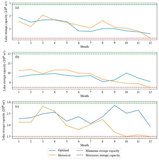 The comparison of the storage capacity changes in the lakes between the optimized method and the historical methods is as follows: (a) Caizi Lake, (b) Chao Lake, and (c) Wabu Lake.