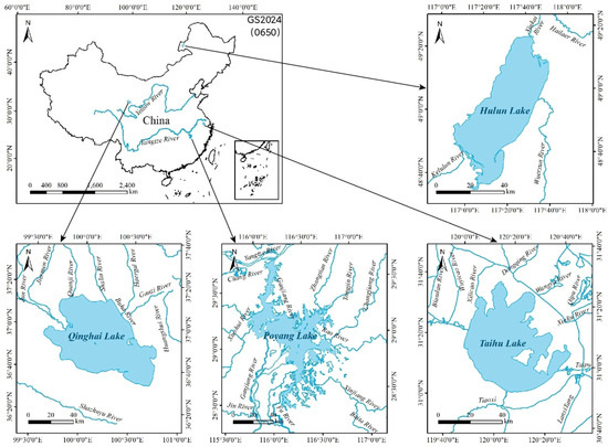 Location maps of typical lakes (Poyang Lake, Taihu Lake, Qinghai Lake, Hulun Lake). This map is drawn based on the standard map (GS (2024) 0650) from the standard map service website of the Ministry of Natural Resources of China.