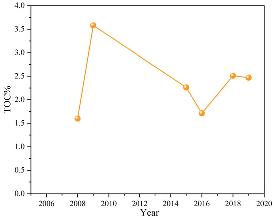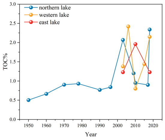 In addition, algal-type ecosystems are developing in some lake areas, such as the lake’s center and the southwest lake area [46]. According to Figure 3, the TOC content in the west of Taihu Lake is in the range of 0.8–1.2% [42,45,46,47,48], with considerable variation. The Taihu Lake basin is located in one of the most prosperous areas of China’s economic development, and under the interference of the accelerated urbanization process, the lake water ecological security has been seriously threatened, and the water quality of the lake has deteriorated more rapidly, with the highest value of TOC reaching 2.42%. Since the “water crisis” in Wuxi City in 2007, implementing ecological restoration projects and governmental environmental protection policies may have impacted the accumulation of OM in sediments [49,50]. Exogenous inputs have been controlled to a certain extent, such as the implementation of ecological dredging projects since 2008, which has led to an obvious trend of reducing the nutrient content of the surface sediments. It had a decreasing trend. However, since 2017, the TOC content has had an increasing trend, probably because the ecological dredging project can remove most of the bottom sediment pollutants, which is conducive to improving water quality and the ecological environment. However, 99.7% of the persistent harmful pollutants will be adsorbed on the fine particles with a diameter of less than 74 μm, and the strong disturbance generated by dredging easily causes the resuspension of fine particles of sediment, which also increases the probability of the release of contaminants from the bottom mud [51,52,53,54].