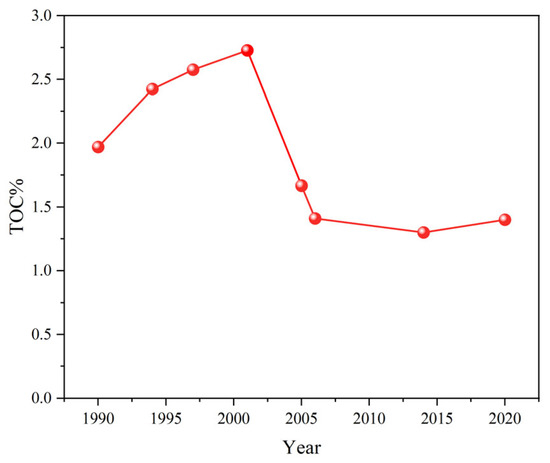 As illustrated in Figure 2, the TOC content of Poyang Lake sediments has remained within the range of 0.5% to 1.2% over the past three decades [20,21,22,23,24,25,26,27,28,29], exhibiting a gradual upward trend. This increase may be attributed to the significant economic development and urbanization within the watershed, which have contributed to the deterioration of lake water quality and, consequently, a rise in OM concentration in the sediments. Among them, the TOC content in the sediments of Poyang Lake was significantly lower in 1992, which may be related to the fact that the period of collecting sediment samples in 1992 was a dry water period. Poyang Lake has abundant water from April to September yearly and dry water from October to March. Significant differences exist in water quality, area, recharge–runoff–discharge, and storage between abundant and dry water [30,31]. Some studies have shown that the concentration of OM in the sediments of the lake area of Poyang Lake is significantly higher in the abundant water than in the dry water period [32]. During the abundant water period in the area in the late rice transplanting season, the farmland applies a large amount of organic fertilizers and chemical fertilizers, and the surface source pollution load caused by surface runoff increases. Pollutants enter the lake body with surface runoff during the abundant water period, thus promoting sediment disturbance. During the dry season, the water from the “Five Rivers” decreases, and the pollutants in the northern lake area are constantly diluted by the water from the middle and upper reaches of the Yangtze River, which leads to a decrease in the OM content of the sediments.