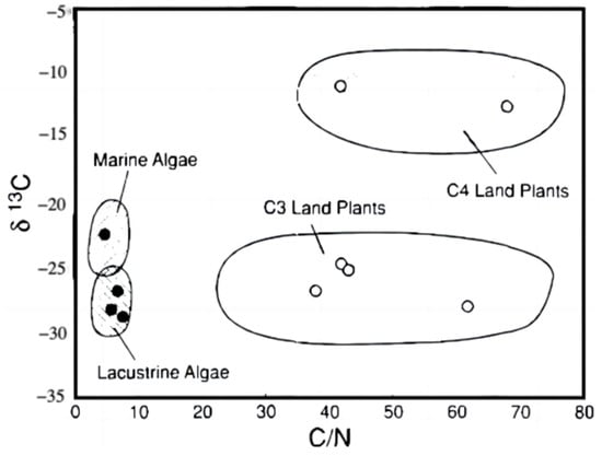 The δ13C value and C/N ratio of major source plants in lake sediment OM. Reproduced with permission from [83]. Copyright 1994, Elsevier.
