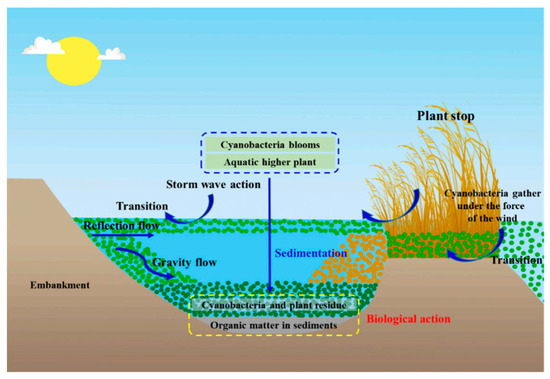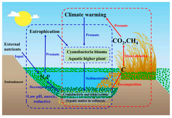 OM transport and transformation pathways in eutrophic lakes (blue arrows represent cycles affecting eutrophication, red arrows represent cycles affecting climate warming). Reproduced with permission from [74]. Copyright 2023, MDPI.