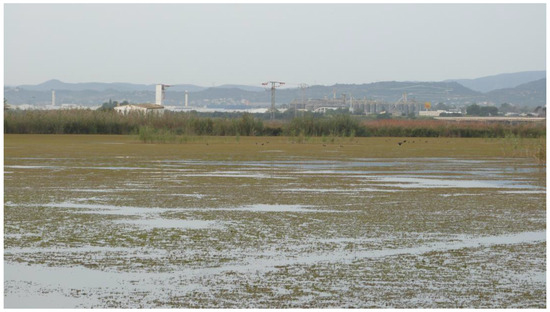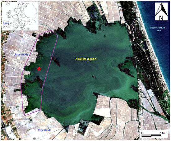The Albufera of Valencia (Figure 1) is a shallow, hypertrophic, oligohaline Mediterranean coastal lagoon that covers an area of 2320 hectares. It is surrounded by 16,000 hectares of marshland that are used for rice cultivation. The lagoon is located 10 km south of the city of Valencia (Spain). The volumes of water reaching the lagoon are controlled by the Jucar Basin Authority, while the water level inside the lagoon is controlled by the Drainage Council, which is comprised of farmers and is responsible for adjusting the water level according to the needs of the rice fields [27,28].