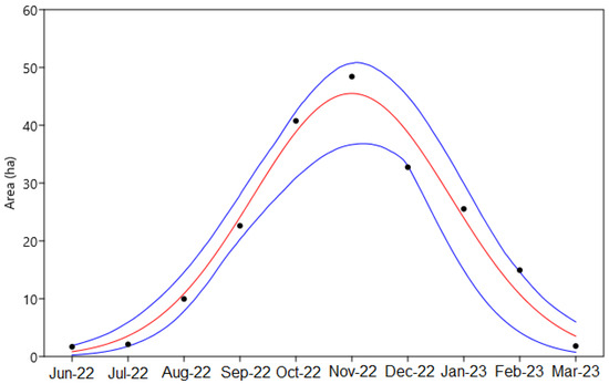 Evolution of the area occupied by N. marina in the Albufera de Valencia during the period of growth and disappearance. The red line indicates the Gaussian distribution function fit, while the blue lines indicate the 95% probability interval.