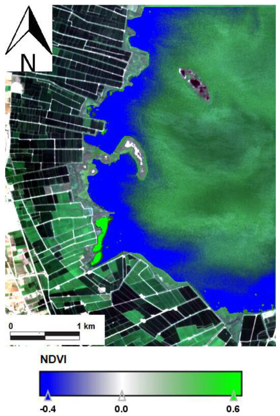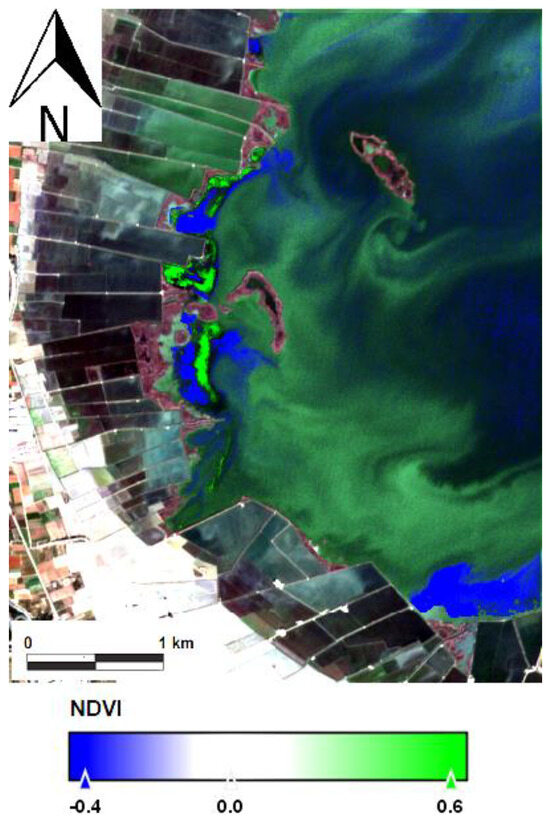 NDVI thematic map of 8 August 2022. Blue areas indicate clearer waters. Brilliant Green indicates the area covered by N. marina.