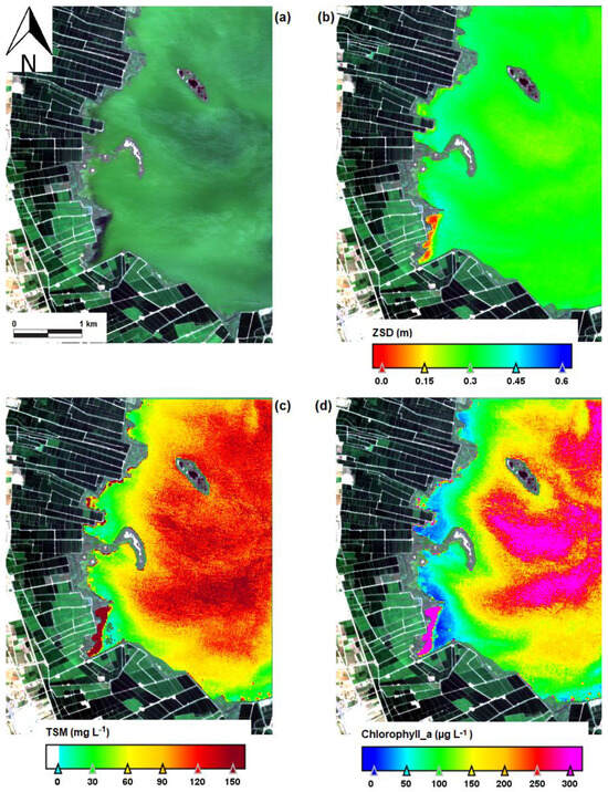 Thematic maps of 4 February 2023 showing (a) false colour; (b) Secchi disk depth; (c) suspended solids concentration; (d) chlorophyll-a concentration.