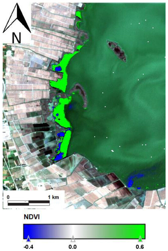 From the methodological perspective employed in our study, it has been determined that there is a paucity of specific studies on the NDVI methodology applied specifically to N. marina, with the majority of studies encompassing multiple species per area and failing to differentiate between species. This is exemplified by Ma et al. [45], who utilised the NDVI to analyse changes in both emerged and submerged vegetation cover within Lake Taihu (China) by employing Landsat Thematic Mapper images. Their findings indicated a substantial decline in vegetation cover between 2001 and 2007.
