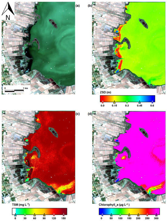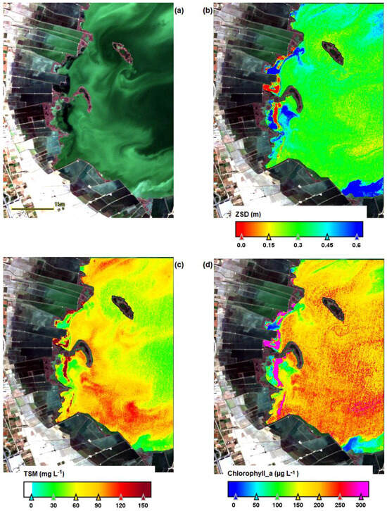 Thematic maps of 8 August 2022 showing (a) false colour; (b) Secchi disk depth; (c) suspended solids concentration; (d) chlorophyll-a concentration.
