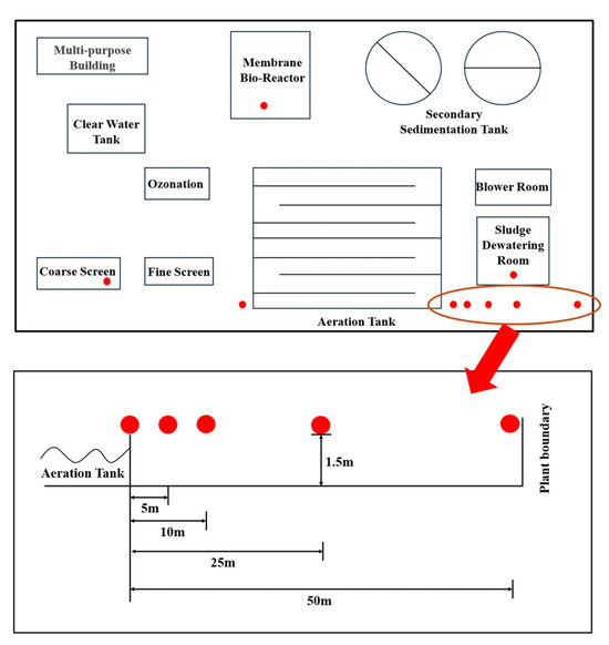 This study selected a municipal WWTP in Beijing employing a multistage A/A/O process coupled with MBR. The facility occupies 6.19 hectares, serves a catchment area of 70 km2 with a population of 100,000 residents, and processes 70,000 tons of municipal wastewater daily. The sampling was conducted from 8 to 12 November 2021. Specific details regarding the sampling schedule are provided in Supplementary Text S1. Sampling sites were selected at 0 m upwind and 0, 5, 10, 25, 50 m downwind of the AerT, along with the coarse screen (CS), MBR, and sludge dewatering room (SDR). The facility layout with geospatial sampling configuration is illustrated in Figure 1, while comprehensive sampling metadata are tabulated in Table S1.