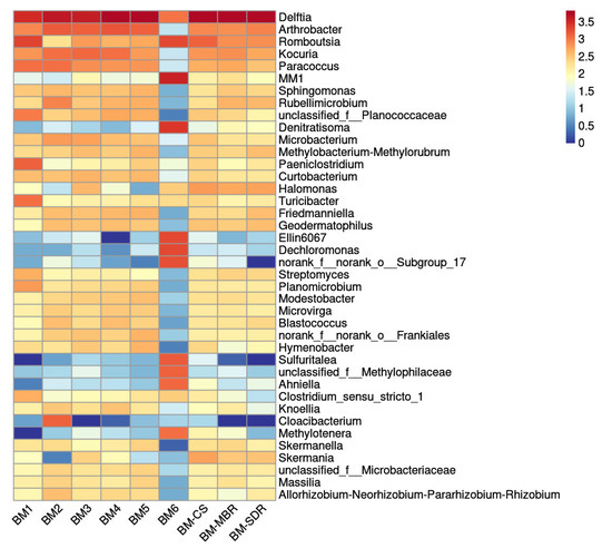 Delftia predominated at all sampling sites, exhibiting absolute dominance. Romboutsia and Arthrobacter were significantly enriched in specific process units, including the AerT, MBR, CS, and SDR, where they emerged as dominant taxa. Notably, distinct aggregation of specialized genera such as MM1, Denitratisoma, Ellin6067, and Sulfuritalea was detected 50 m downwind of the AerT. These taxa exhibited relatively low abundances at other sampling sites, particularly in the SDR. The bacterial community compositions of aerosols collected at 0 m, 5 m, 10 m, and 25 m downwind of the AerT showed high similarity (Figure 2), indicating low spatial heterogeneity and significant convergence in the microbial community structure within this proximity range, along with high stability [30]. In contrast, the community composition at 50 m downwind diverged markedly from these proximal sites, with most genera displaying reduced abundances. This divergence may be attributed to the attenuation and restructuring of microbial communities during aerosol particle transport in outdoor environments, driven by the combined effects of meteorological factors such as wind speed, air temperature, and relative humidity over increasing diffusion distances [1].