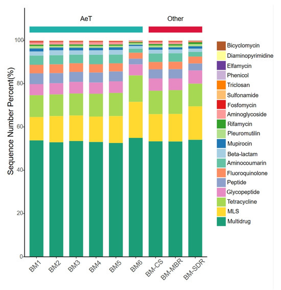 As shown in Figure 3, aerosol-borne ARG types (>1%) in the WWTP displayed highly similar compositional profiles across all sampling sites. Multidrug resistance genes dominated with an average relative abundance of 52%, followed by tetracycline (11%), MLS (10%), and glycopeptide (7%) resistance genes. This distribution pattern aligns with findings from the study [32] on aerosol-borne ARGs in a large-scale WWTP in Hong Kong and corroborates the ubiquitous enrichment of multidrug resistance genes in both aerial and aquatic environments reported by global studies. This phenomenon may be attributed to the widespread presence of multidrug antibiotics in environmental matrices, which exert co-selective pressure on microbial communities, driving the emergence of multidrug ARGs through adaptive mechanisms such as mutation [33,34]. Mechanistic studies reveal that multidrug ARGs frequently encode P-glycoprotein-like efflux pumps capable of expelling hydrophobic cytotoxic compounds, thereby conferring cross-resistance to multiple antibiotic classes and posing heightened risks to public health [35].
