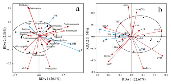 RDA analysis of ARGs through aerosols and environmental factors. (a) ARG types, (b) ARG subtypes.