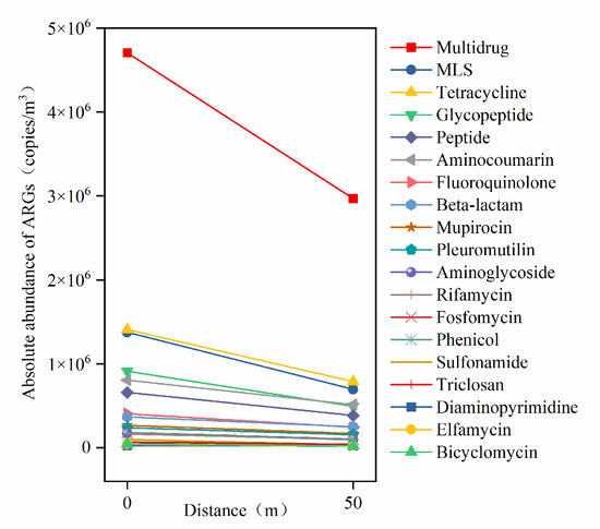 The AerT in the WWTP were selected as the emission source, and six sampling points were established at 0 m upwind and 0 m, 5 m, 10 m, 25 m, and 50 m downwind of the tanks for aerosol sample collection. To investigate the horizontal dissemination characteristics of ARGs, the relationship between the absolute abundance of ARG types and downwind distance is illustrated in Figure 5.
