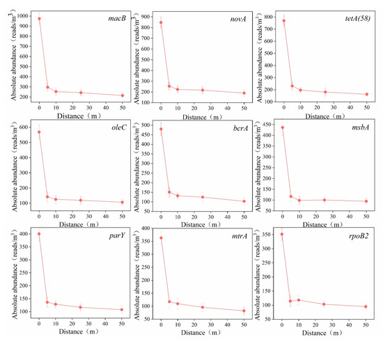To clarify the horizontal dissemination characteristics of ARG subtypes, the nine most abundant subtype ARGs (macB, novA, tetA(58), oleC, bcrA, msbA, parY, mtrA, and rpoB2) were selected, and their variations in absolute abundance across horizontal distances are shown in Figure 6.