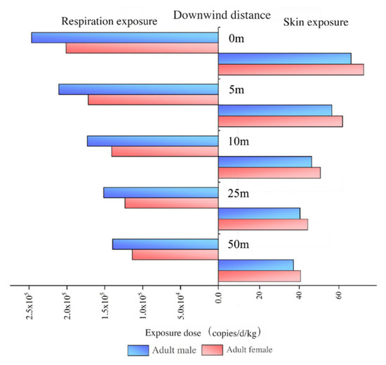 As shown in Figure 8, the exposure doses of aerosol-borne ARGs via both respiration and skin contact pathways decreased with increasing downwind distance from the aeration tanks. When the distance increased from 0 m to 50 m, the respiration exposure dose for adult males declined from 2.47 × 105 copies/d/kg to 1.40 × 105 copies/d/kg, while the skin exposure dose decreased from 66.92 copies/d/kg to 37.86 copies/d/kg. For adult females, the respiration exposure dose decreased from 2.01 × 105 copies/d/kg to 1.14 × 105 copies/d/kg, and the skin exposure dose declined from 73.24 copies/d/kg to 41.44 copies/d/kg. Compared to the emission source (aeration tanks), the exposure doses of aerosol-borne ARGs at 50 m downwind decreased by 43.32% (respiration contact) and 43.43% (skin contact). These results demonstrate that the attenuation of aerosol-borne ARG abundances downwind directly drives the reduction in exposure doses with increasing distance.