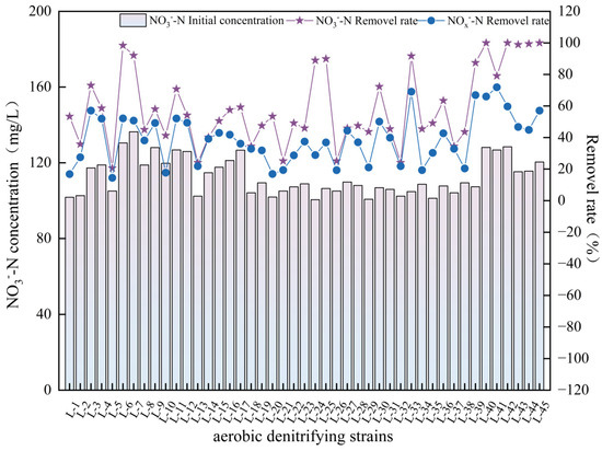 Therefore, the shaking speed is the decisive factor affecting the NO3−-N removal efficiency of immobilized aerobic denitrifying bacteria gel beads prepared using the optimal ratio (PVA: 10 g/100 mL, SA: 4 g/100 mL, CaCl2: 2 g/100 mL, bacterial embedding amount: 2 g/100 mL). When the shaking speed is too low, the gel beads’ NO3−-N removal efficiency significantly decreases, which may be due to the insufficient shaking speed leading to a low dissolved oxygen concentration within the reactor. The gel beads have a certain resistance to oxygen transmission, which prevents the key enzyme of the aerobic denitrification process, intracellular nitrate reductase (Nap), from functioning properly [13]. The gel beads can protect the activity of aerobic denitrifying bacteria and reduce the impact of unfavorable external conditions, hence the smaller influence of temperature and pH changes on the NO3−-N removal efficiency.