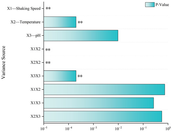 Analysis of the significance of the pH, rotation speed, and temperature on the nitrate removal efficiency. ** Indicates p-value < 0.001.