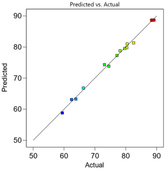 The residual distribution plot of the fitted model is shown in Figure 3. The residuals of the model fluctuate near the fitting line, and the predicted values produced by the model basically match the actual values, indicating that the quadratic model has a high degree of fit and can be used for prediction and evaluation purposes.
