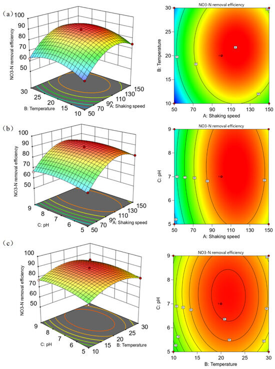 The interaction relationships between the shaking speed and temperature, the shaking speed and pH, and the temperature and pH are shown in Figure 4. The results indicate that the interaction between the shaking speed and temperature is not significant (0.7386). Moreover, the change in shaking speed has a greater impact on the NO3−-N removal efficiency of the immobilized aerobic denitrifying bacteria gel beads than the change in temperature. The change in shaking speed has a greater influence on the NO3−-N removal efficiency than the change in pH, and the change in temperature has a greater impact on the NO3−-N removal efficiency than the change in pH. The interaction among the three environmental factors is not significant. This is different from previous reports, which stated that the TN removal rate of Corynebacterium pollutisoli SPH6 was significantly affected by the interaction between pH and C/N [13].