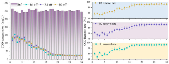 The concentration and removal rate of CODcr in the inlet and effluent during the operation of each reactor.