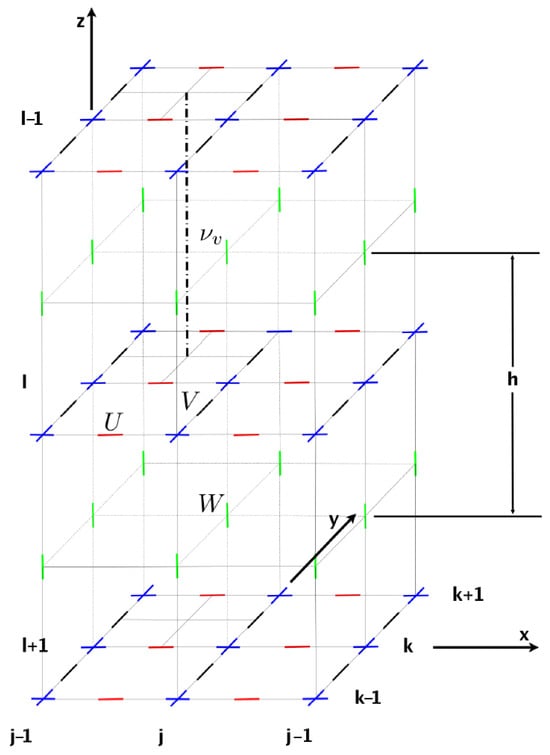 In this study, a staggered numerical grid of the Arakawa C type is employed, as shown in Figure 1 (see, e.g., [,]). Staggered grids (also known as decoupled grids), are characterized by the separation of points where different variables are defined, which allows for a straightforward application of central difference schemes and thus enhances the accuracy of the numerical model. The C-type grid is naturally linked to the conservation law scheme, according to which changes in a quantity within a bounded region result from the fluxes of that quantity through the bounding surfaces. The vertical velocity, depth, free surface displacement, and wave parameters are defined at the center of the grid cell, while the velocity components in the x- and y-directions are shifted by half a grid cell width westward and northward, respectively (i.e., they are defined on the cell edges). The velocity component in the vertical direction is shifted by half a grid cell width in the vertical direction. Such grids are commonly used in numerical solutions of hydrodynamic problems.
