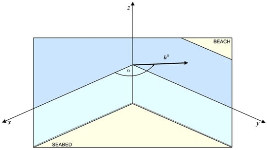 The coordinate plane is placed on the bathymetric map such that the x-axis is perpendicular and the y-axis is parallel to the aligned shoreline. All model data, including depth D and wave parameters (height H, length L, period T, incidence angle ), are functions of the position vector . Consequently, all quantities used in the model (scalar, vector, and tensor) are also functions of the position vector. All vectors and tensors are expressed in terms of their components (each of which must be expressed using the variable (15)).
