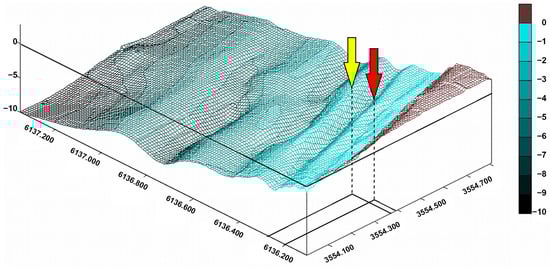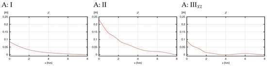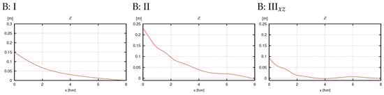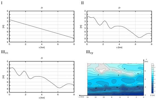 Three sets of bathymetric data were prepared: the first, labeled as I, represents a flat seabed with a constant slope; the second (II) is a multibar profile maintaining alongshore homogeneity; and the third (III) corresponds to the actual seabed topography of the coastal zone in the Lubiatowo region. The depth values corresponding to these datasets are presented in Figure 4 and Figure 5.