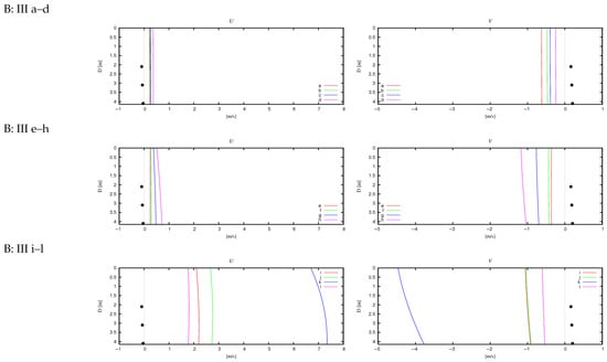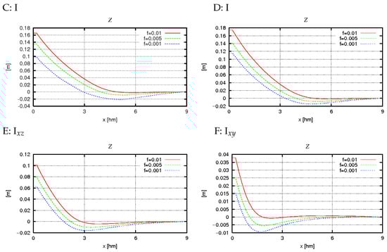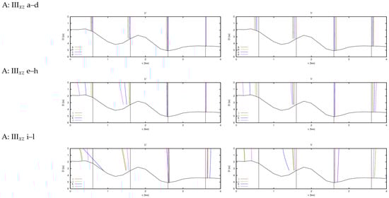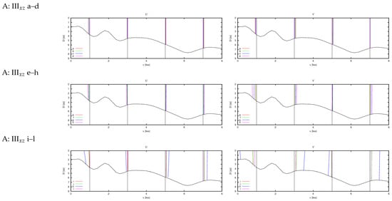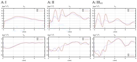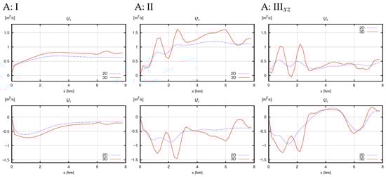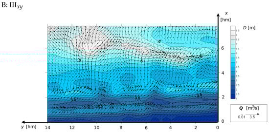 - The presence of nonzero derivatives with respect to the y coordinate in the real case (III) significantly modifies the obtained cross-shore profiles compared to case II. This primarily concerns the change in direction of the alongshore components of volumetric current transport (Figure 12 and Figure 14: IIIxz), bottom friction (Figure 13 and Figure 15: IIIxz), and velocity (Figure 18 and Figure 19), as well as the values of free surface elevation (Figure 20 and Figure 21: IIIxz). The differences between the values obtained using the 2D and 3D model equations are similar to those observed in case II. The velocity results obtained from calculations and can be used as a preliminary assessment of the influence of the derivative on the velocity values (since it is not included in ).