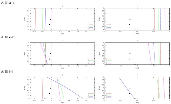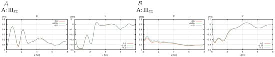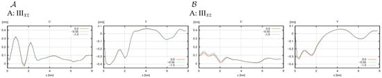 Current velocity U and V for different values of , obtained from calculations () (left) and () (right), corresponding to the wave parameters A and the bathymetric (III).