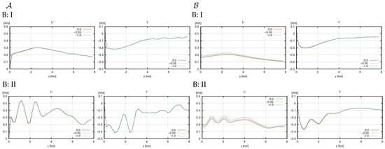 Current velocity U and V for different values of , obtained from calculations () (left) and () (right), corresponding to the wave parameters B and the bathymetric data (I)–(II).