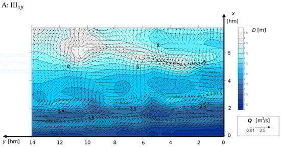To demonstrate the capabilities of the presented model, two-dimensional fields of internal volumetric current transport are shown for wave data A (Figure 22) and B (Figure 23). These figures indicate that the difference between values obtained for data A and B is much greater than inferred from cross-shore profiles alone. The obtained vector fields exhibit substantial variability in both the cross-shore and alongshore directions. These fields allow the identification of certain circulation zones and even regions where rip currents may occur. However, it appears that the advantages of the presented model compared to Q3D models would be more pronounced in more complex coastal areas, such as around islands or peninsulas.