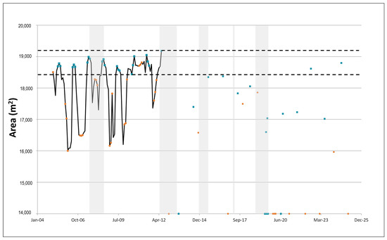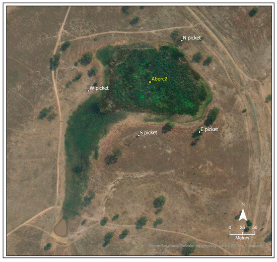 The wetted area extent at Abercorn Mound Spring was monitored between 2005 and 2025 using two different approaches. The first approach is based on methodology established by Fairfax and Fensham [27], which describes a relationship between spring flow and vegetated wetland area, with the principle that perennial wetland plants only grow where there is permanent water [28]. This method was modified to involve direct measurement of the wetted perimeter along six set bearings from four permanent markers that were placed around the spring in 2005 (Figure 2). The wetted perimeter is defined as the point where free water exists and where the soil contains free water when stepped upon. A polygon area was then produced based on straight lines between measurement points to measure changes in monthly area (units–m2). Measurements were collected monthly up until April 2007, after which time they were then collected only two times a year (winter: June–August; summer: December–February), with the exception of 2019–2020, where monthly sampling recommenced in June 2019 and ceased after February 2020 due to COVID-19 limitations on fieldwork. This recommencement of monthly sampling aligned with the commencement of pumping in 2019. Assessment of the monthly measurements showed that the most change to the wetted area typically occurred between the seasons, so biannual sampling in winter and summer was used to capture the seasonal variation as well as short-term impacts and recovery signals.