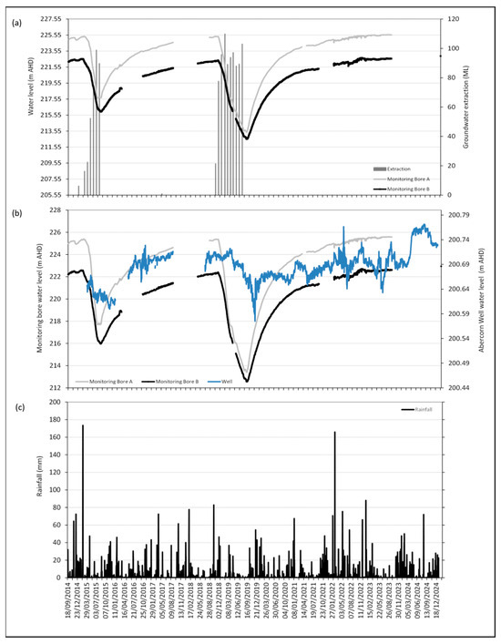 (a) Source aquifer water level in response to pumping activity (water use data supplied by licensee), (b) water level behaviour in Abercorn Well (2014–2024), and (c) rainfall (mm).