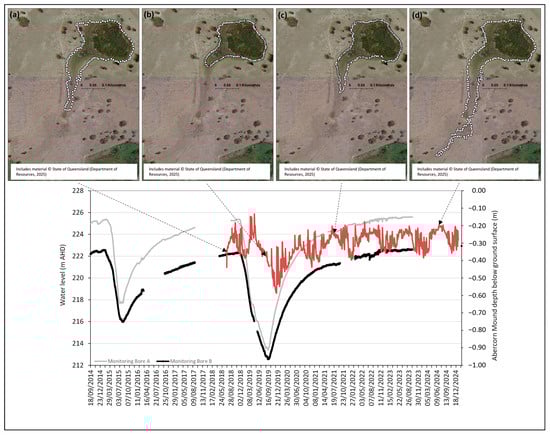 Groundwater level behaviour at Abercorn Mound Spring (red) in relation to upgradient monitoring bore levels. Graphic insets show the wetted area extent at Abercorn Mound Spring at corresponding water levels during (a) winter 2018, a period of groundwater pressure recovery following cessation of pumping in mid-2015; (b) winter 2019, a period of groundwater extraction; (c) winter 2021, a period of groundwater pressure recovery following cessation of pumping; and (d) winter 2024, groundwater pressure restored.