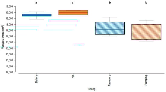 Statistical analysis of the effect of pumping on the wetted area of the Abercorn Mound Spring wetland revealed a significant effect of pumping (Tukey–Kramer test, p = 0.0001). The mean wetland area for the ‘Before’ and ‘No’ groups was similar (Figure 6, group a), as was the mean wetland area for the ‘Pumping’ and ‘Recovery’ groups (Figure 6, group b). There were significant differences between the mean wetland area for group a (‘Before’ and ‘No’ groups) and group b (‘Recovery’ and ‘Pumping’ groups).