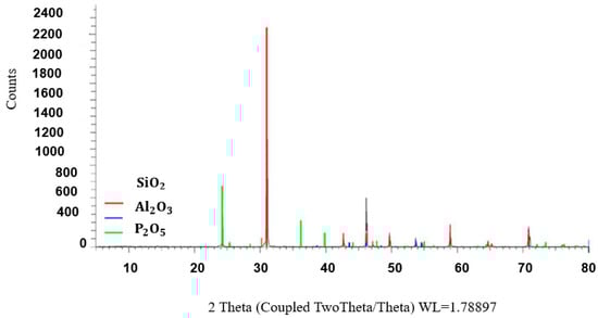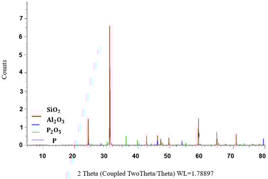 Figure 2 illustrates the X-ray diffraction (XRD) spectrum of the raw quartz packed-bed filtration, providing insights into its crystalline structure and phase composition. The diffraction peaks confirm that silicon dioxide (SiO2) is the predominant phase, as evidenced by the prominent and well-defined peaks at characteristic 2θ values, represented in red. Additionally, the presence of minor peaks attributed to aluminum oxide (Al2O3), denoted in blue, suggests trace levels of alumina impurities. The sharp and intense peaks observed in the XRD spectrum indicate a high degree of crystallinity in the quartz material, which is essential for maintaining mechanical robustness, thermal stability, and chemical resistance. Similar findings have been reported in previous studies, corroborating the results obtained in this research [78,79].