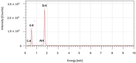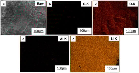 In Figure 5b, carbon (C-K) is detected in minor concentrations, likely associated with trace organic contaminants or carbonates adsorbed on the surface. The oxygen distribution (Figure 5c) is widespread and homogenous, as expected for silicon dioxide (SiO2)-based materials. Figure 5d reveals localized occurrences of aluminum (Al-K), supporting the XRD findings of minor alumina content, which could contribute to enhanced mechanical strength. Most notably, Figure 5e highlights a dense and uniform distribution of silicon (Si-K), reinforcing the quartz’s silicon-rich composition and structural integrity.