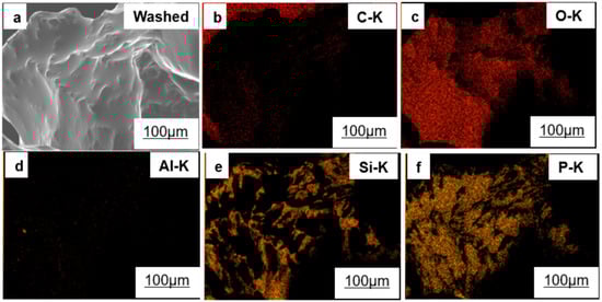 Elemental mapping results show the spatial distribution of key elements across the quartz surface. Figure 7b,c confirm the widespread presence of carbon (C-K) and oxygen (O-K), respectively, which are common in naturally occurring quartz and residual organic films. Figure 7d shows a sparse distribution of aluminum (Al-K), suggesting trace alumina contamination likely retained during pre-treatment. More significantly, Figure 7e illustrates a homogenous spread of silicon (Si-K), verifying the material’s silica-rich composition. Notably, Figure 7f reveals the incorporation of phosphorus (P-K), not observed in the raw quartz, confirming that the acid-washing process introduced phosphorus-containing species, such as phosphates, onto the surface.