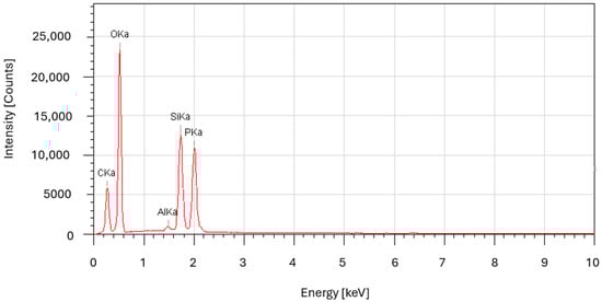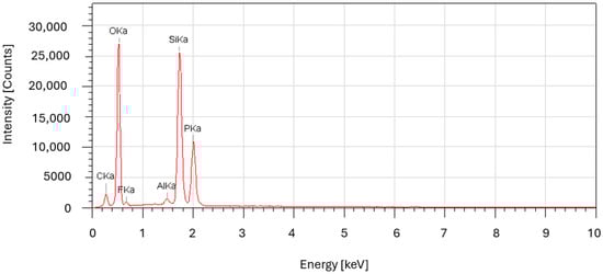 These elemental observations are corroborated by the EDS spectrum shown in Figure 8, which quantifies the detected elements in the washed quartz sample. Peaks corresponding to O-K and Si-K dominate the spectrum, consistent with the quartz mineral’s chemical makeup. Additional, albeit smaller, peaks for Al-K and P-K support the successful deposition or exposure of alumina and phosphorus compounds. These elemental enhancements are crucial, as both Al2O3 and P2O5 have been associated with improved packed-bed filtration hydrophilicity, oil rejection efficiency, and resistance to fouling.