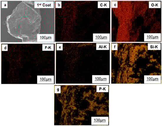 (a–g) SEM image of first coating quartz illustrating the distribution of nanoparticles. (a) First-Coated Quartz (b) Carbon (C-K), (c) Oxygen (O-K), (d) Fluorine (F-K), (e) Aluminum (Al-K), (f) Silicon (Si-K), and (g) Phosphorus (P-K).