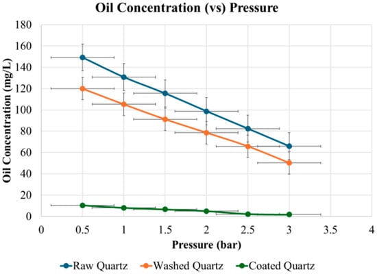 The oil rejection efficiency is governed by the capillary entry pressure , which determines whether oil droplets can enter the packed-bed filtration pores. Using the Young–Laplace Equation (2) [69], where is the interfacial tension between water and oil, is the water contact angle on the quartz packed-bed filtration, is the average pore radius.