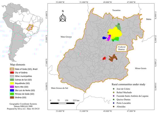 Map of Brazil showing the location of the state of Goiás and the geographical distribution of the communities under study (the capital of the State, Goiânia, is marked in red).