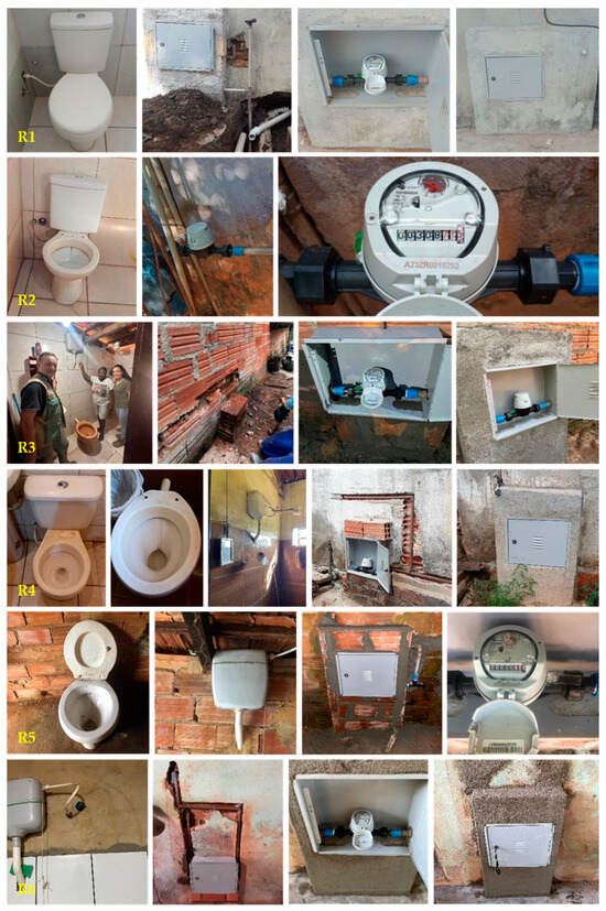 Bypass in the pipeline with the installation of a volumetric water meter before the toilet to record the volume of water used for flushing. Note: R1: Almeidas—Silvânia; R2: Queixo Dantas—Mimoso de Goiás; R3: Porto Leucádio—São Luíz do Norte; R4: Fazenda Santo Antônio da Laguna—Barro Alto; R5: José de Coleto—Colinas do Sul; R6: Rafael Machado—Niquelândia.