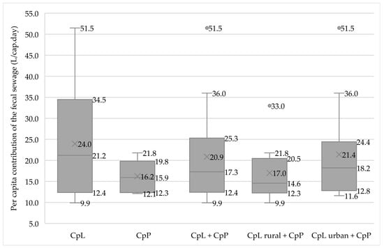 The per capita contribution values from the literature (CpL) were plotted alongside the values obtained in this study (CpP) and combined (CpL + CpP) (Figure 3). When considering all values, the CpL of 51.5 L/cap.day appears as an outlier, indicating that it is not representative of a typical household, which may be due to the use of a non-conventional toilet combined with the residents’ habits of flushing. When considering only literature values from rural households, the CpL of 33.0 L/cap.day is atypical, with an average of 17.0 L/cap.day—slightly higher than the average CpP of 16.2 L/cap.day.